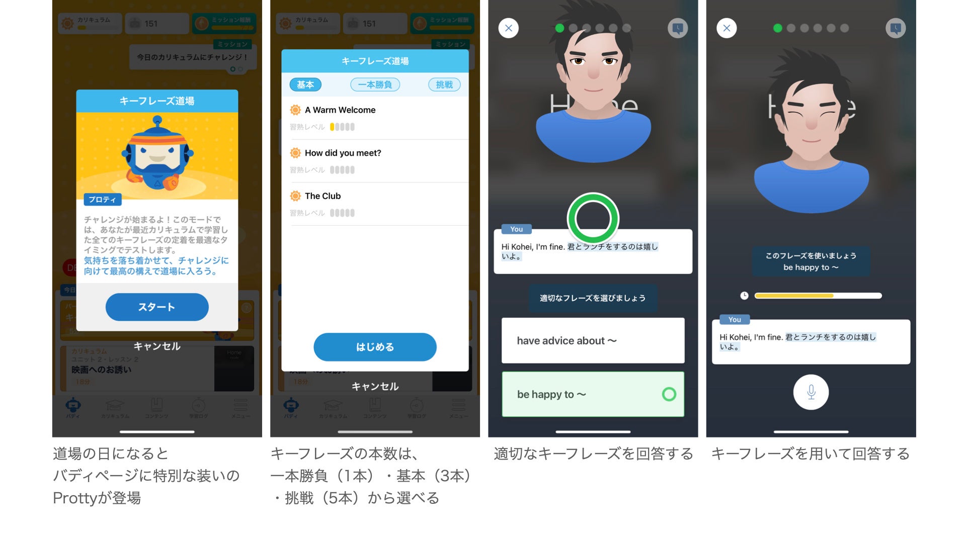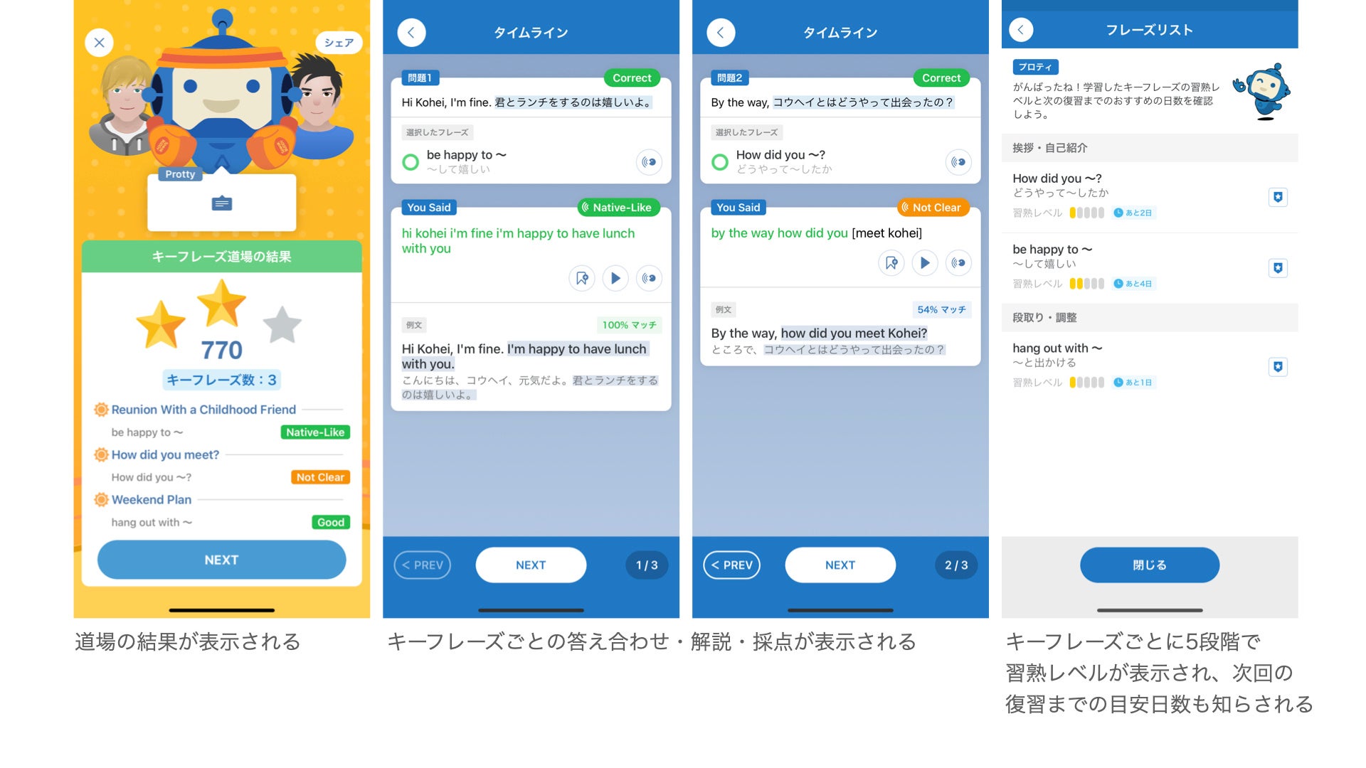 新機能「キーフレーズ道場」ではパーソナルAIを活用した機能面の進化はさることながら、ユーザーに楽しく復習を進めてもらうための演出にもこだわっています。