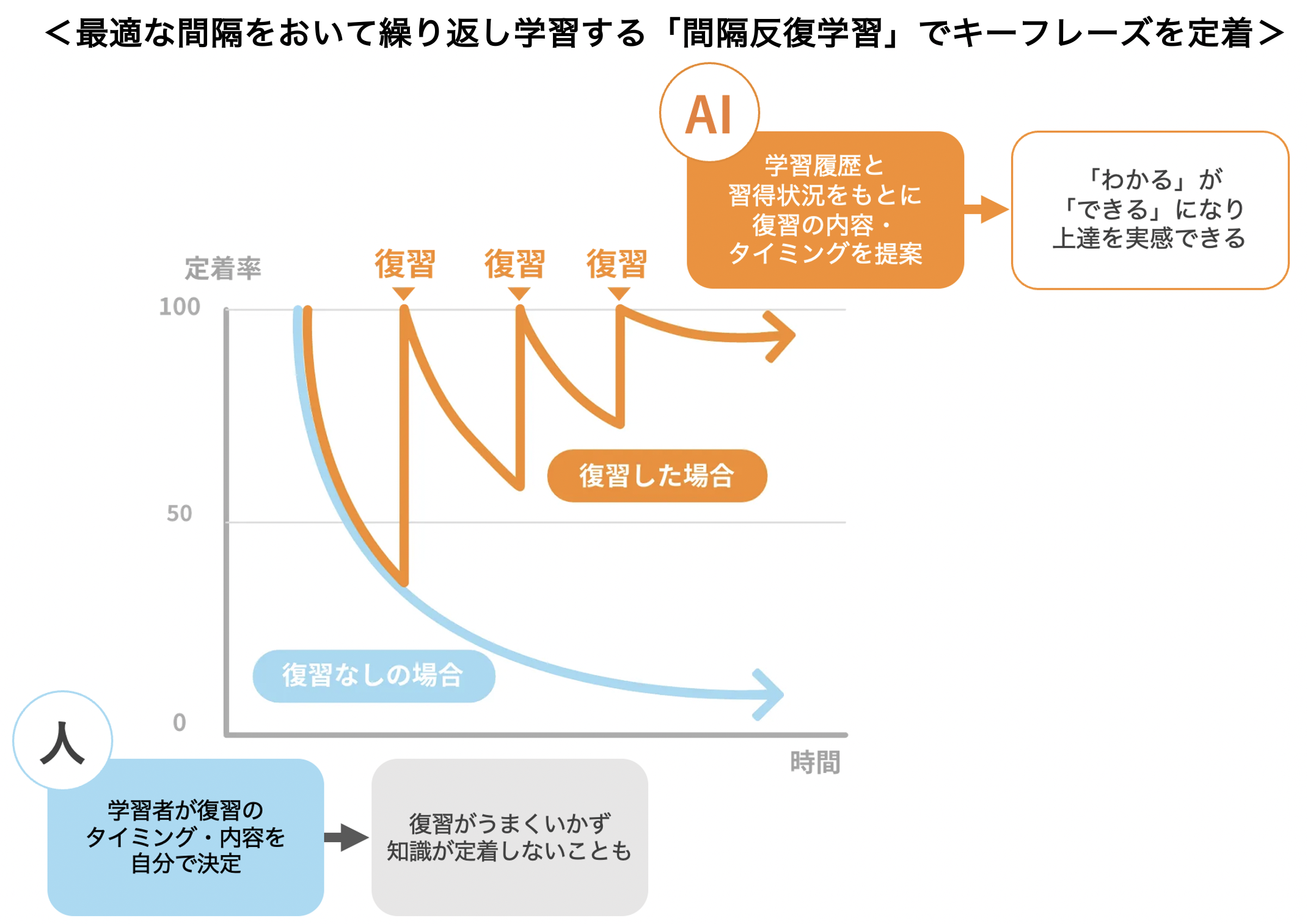 このたび提供開始する「キーフレーズ道場」では、適切なタイミングで適切な内容を繰り返し練習することで定着を促します。こうした学習方法は「間隔反復学習(Spaced Repetition Learning)」と呼ばれており、十分なレベルで習得されるまで、最適な間隔をおいて繰り返し学習することの有効性が証明されています。