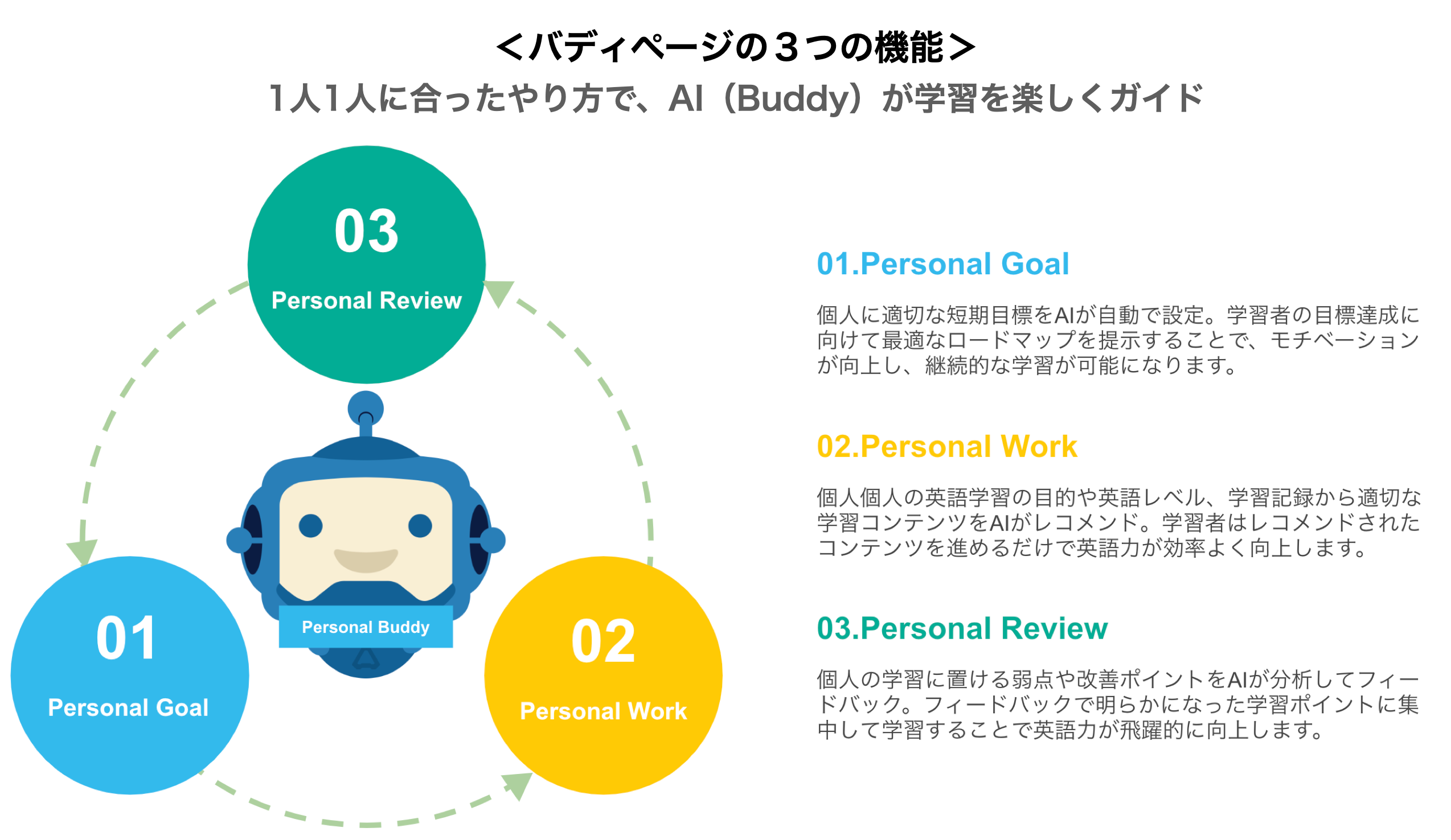 従来、英語を習得するためには特別な努力・特別な環境(インターナショナルスクールや留学、高度なコーチングサービスを受講するなど)に身をおく必要があると考えられてきました。しかし、これまでに多くの分野でAIによる技術革新が行われてきたのと同じように、英語学習においても、AIが人間を超えるシンギュラリティを迎えています。「人間の講師」と同じ・またそれ以上の学習環境をAIが用意できるのです。バディページおよびそこで提供しているパーソナル・エクササイズは、AIにしかできない効率的なシステムを備えているため、ユーザーの皆さんには最も重要な学習体験に集中していただくことができます。