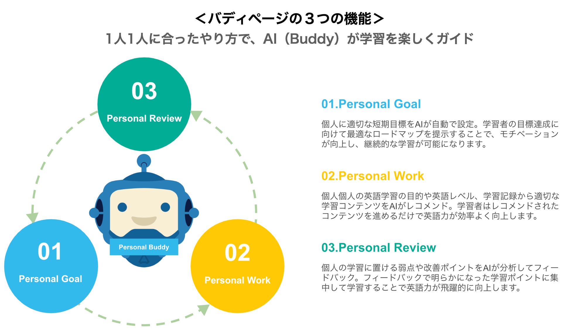 2016年のサービス開始以降、スピークバディでは第二言語習得理論をベースとした学習カリキュラムや忘却曲線などの科学的根拠に基づいたシステム設計によってユーザーの学習効率を高めてきました。さらに、日本語話者独特の英語に対応した高度な音声認識により、的確なフィードバックを重ねるとともに、かわいらしく親しみのあるAIバディによるモチベーションの維持向上に努めています。2022年夏には新機能「バディページ」の提供を開始し、1人ひとりに合った方法で、AIバディがユーザーごとに最適化された学習コンテンツをレコメンドしています。