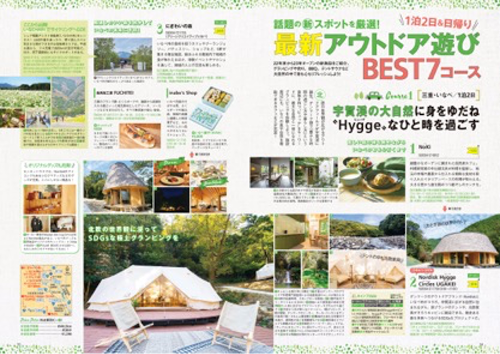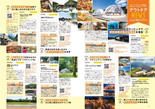 そのほか、最新アウトドア施設を遊び尽くす日帰り&1泊2日のドライブコース特集や、メ~テレ(名古屋テレビ放送)の朝の情報番組「ドデスカ!」で活躍するAぇ! groupのロケ密着企画も掲載。初心者でも安心のキャンプ場&BBQ場などを盛り込んだアウトドアカタログを含め、計200スポットを収録した保存版です。