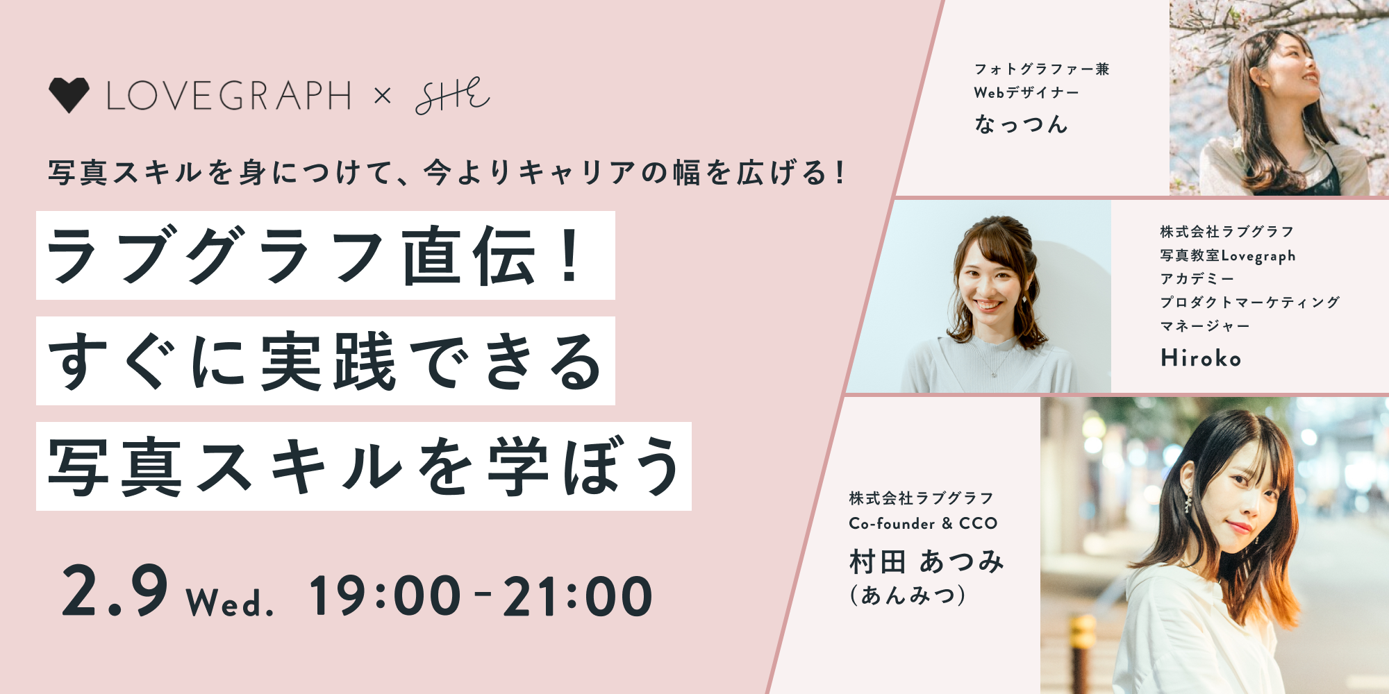 出張撮影サービスを運営する株式会社ラブグラフ(本社:東京都渋谷区、代表取締役社長:駒下純兵、以下ラブグラフ)は、ミレニアル世代向けコミュニティブランドを運営するSHE株式会社(所在地:東京都港区、代表取締役CEO:福田恵里、以下SHE)と提携し、未経験からフォトグラファーを目指す方のキャリア支援を開始します。