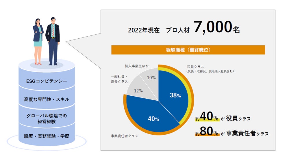 グローバルな環境で多様なビジネス経験を積み、広い視野と経営視点を持つプロフェッショナルが7,000名登録。