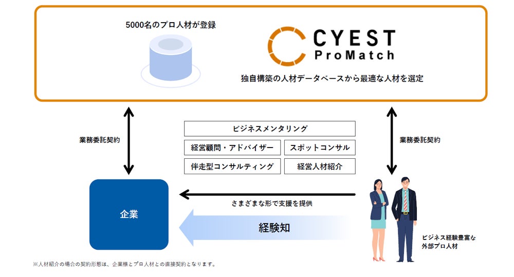「CYEST ProMatch」とは、グローバルビジネスや最先端の経営経験豊富な外部のプロ人材の経験・知見を複数の企業でシェアし、経営課題を解決する経営支援サービスです。ビジネス経験豊富なプロ人材を雇用することなく、「経営顧問」「社外役員」「メンター」「スポットコンサルティング」など様々な支援スタイルで知見をシェアいただき、大企業から中小企業・ベンチャー企業まで様々な企業の経営革新や重要な経営課題への取り組みを即戦力として支援します。また当社プロコーディネートチームが、顧客ニーズとプロ人材の最適なマッチングをサポートいたします。