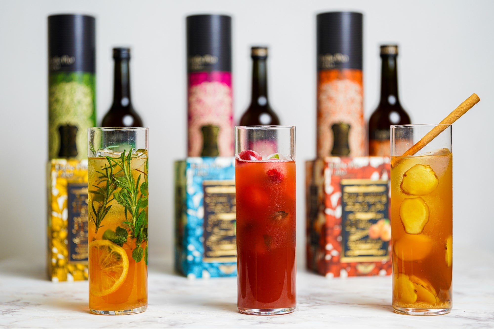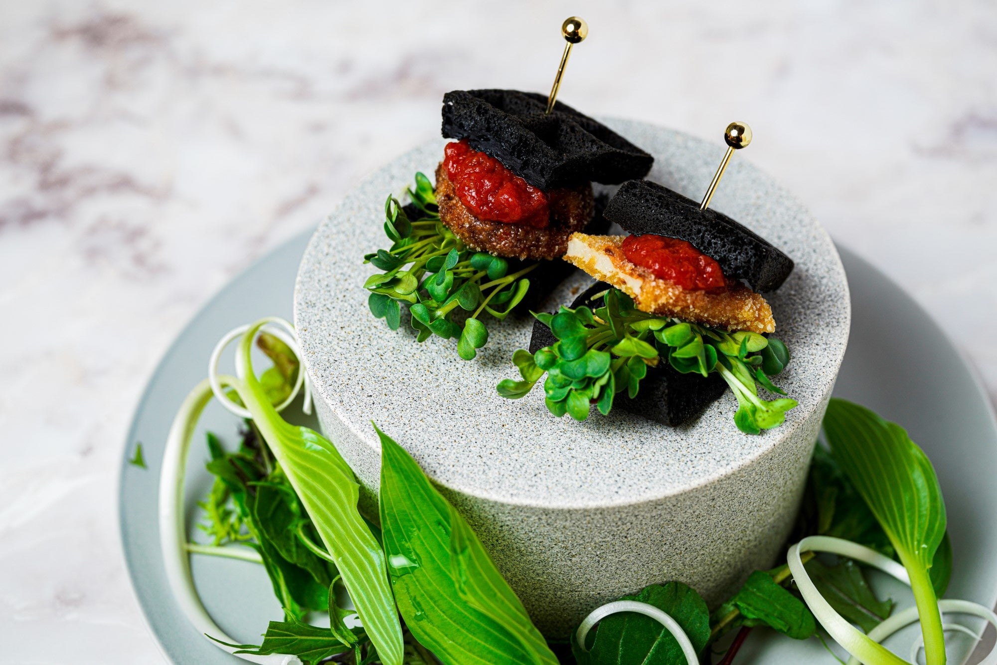 左から「漆黒のヤシ殻活性炭チャコールクレンズパフェ」、「ギルトフリーワッフルサンド 〜 和牛メンチ&白魚のフライ」、「発酵ハーブティークレンズ」