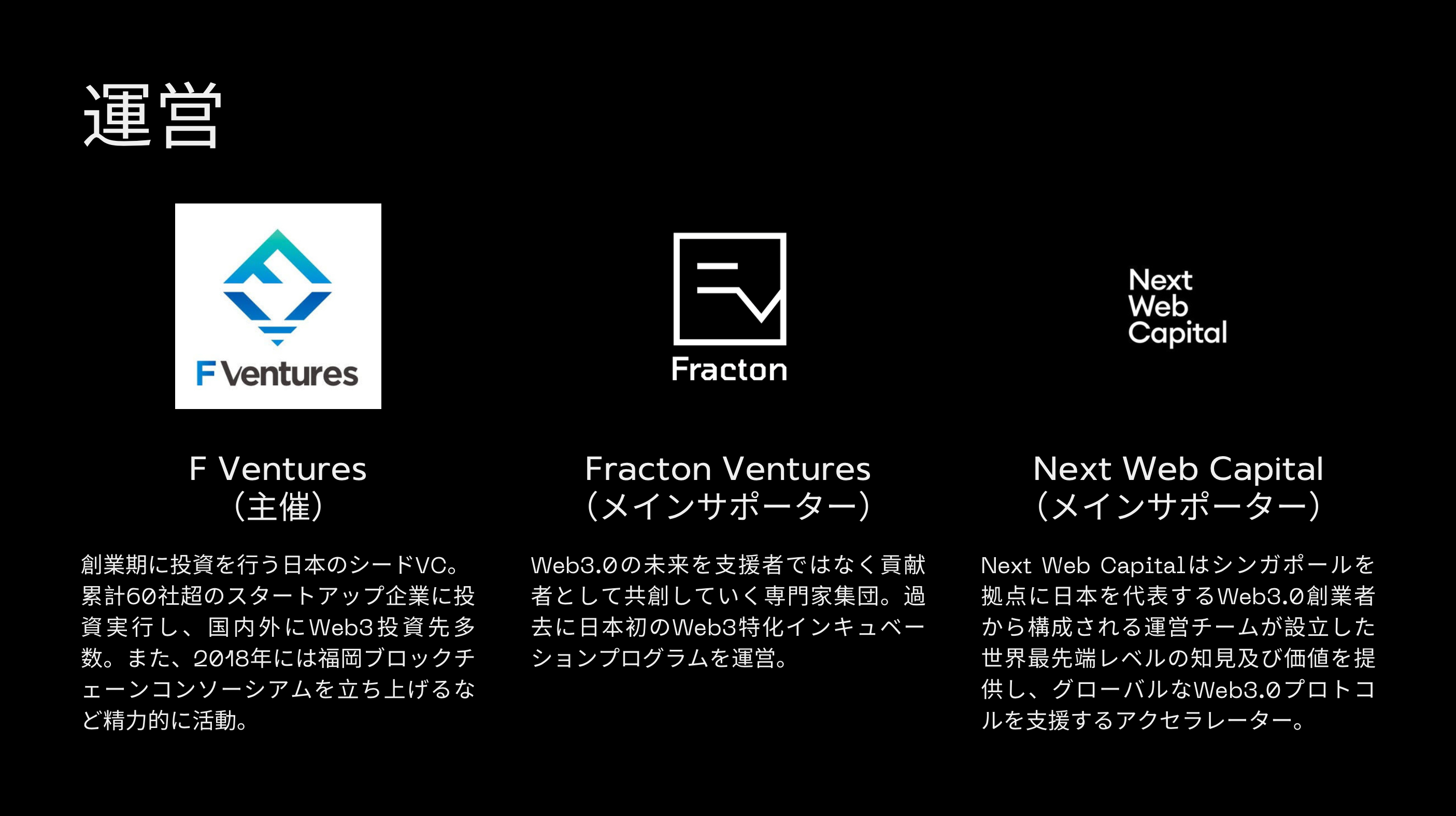 プレシード・シード期のスタートアップに投資を行うベンチャーキャピタルF Ventures(代表パートナー:両角将太)が主催するWeb3インキュベーションプログラム( https://223-fv.xyz/ )のパートナー、メンター及び講座内容が決定致しましたので、お知らせいたします。