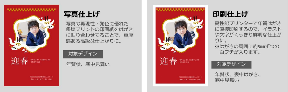 年賀状で人気の高かった「写真あり」タイプのデザインはがきでは、写真の再現性・発色に優れた銀塩プリントの印画紙を貼り合わせた「写真仕上げ」と、高性能プリンターで年賀はがきに直接印刷することでイラストや文字が鮮明に仕上がる「印刷仕上げ」の2種類が選べるようになりました。