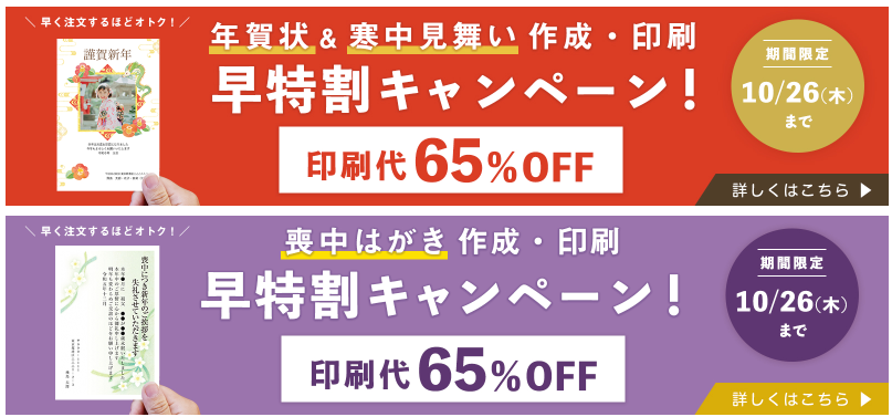 初回はなんと“65%OFFからスタート”します。年賀状・喪中はがき・寒中見舞いいずれも割引対象です。