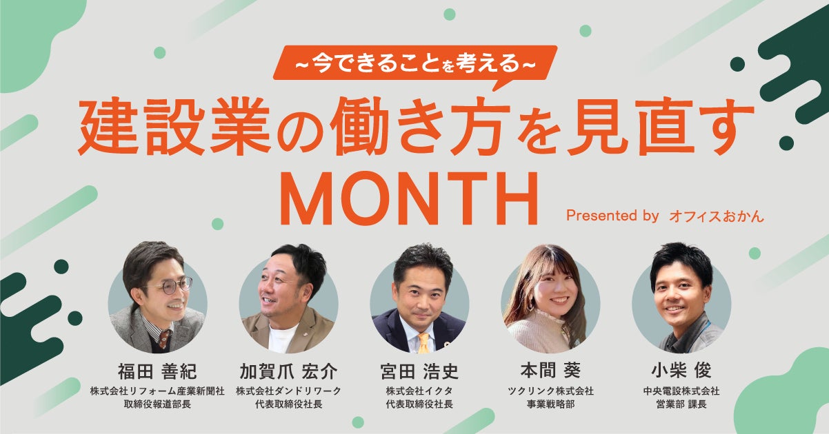 各社の課題には共通する点も多く、この問題の解決に少しでもお手伝いできればと“建設業の働き方を見直すMONTH”では、工務店などの現状をよく理解している有識者や、DX化による業務効率化を支援する業界リーダー、実際に働き方改革を通じて人材採用・定着に力を入れる企業様と共に、業界の組織課題におけるテーマを複数選びました。どのように従業員を支援していくのか、環境をどのように整えれば良いのか、採用・定着を進めるには具体的に何ができるのかなど、建設業の現場から見直すためのきっかけとして、人材採用・定着、働く環境改善の一助となるような情報提供をおこないます。