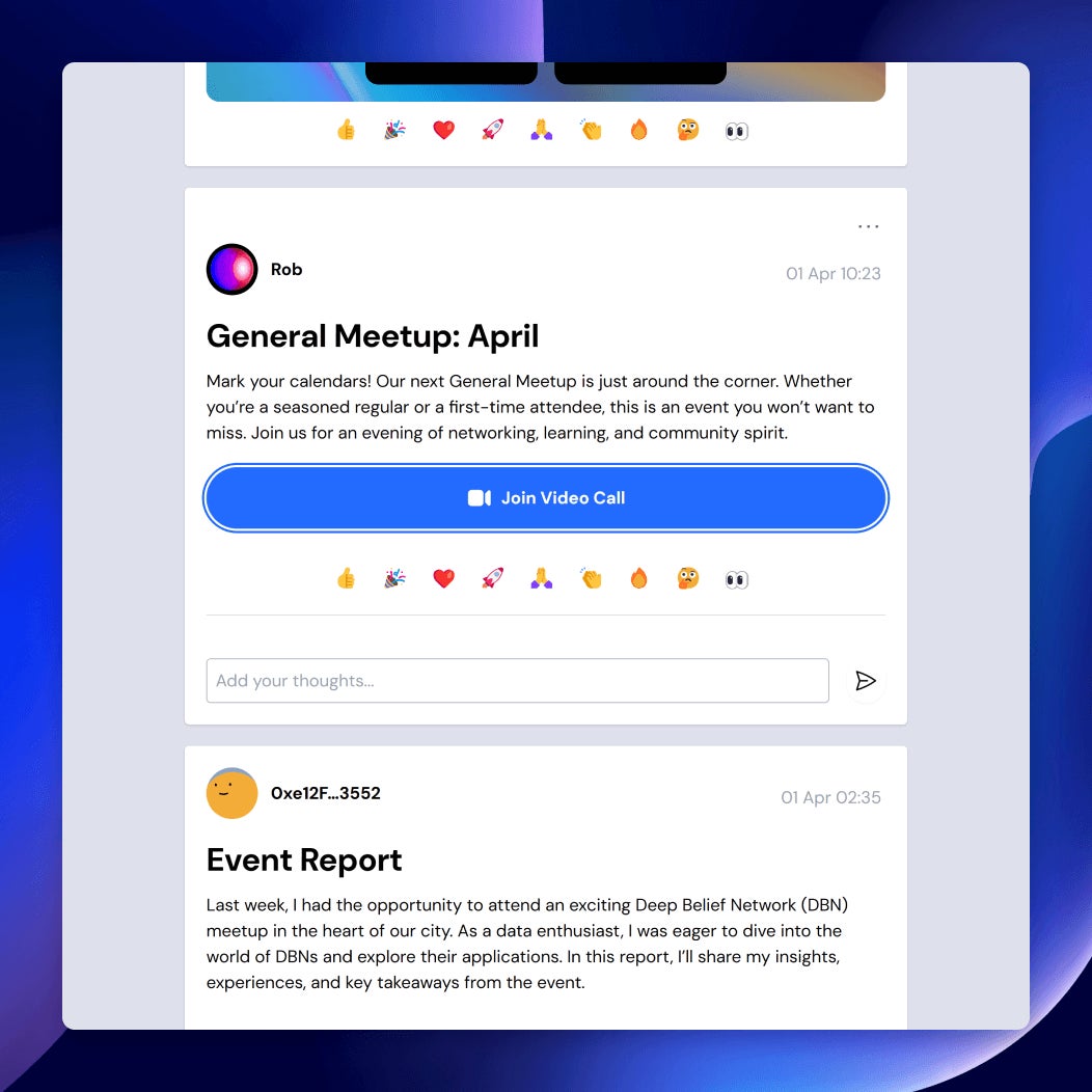 Posts機能は、クラブ上でクリエイターとメンバーが交流できる機能です。これまではテキスト入力によるやり取りが主流でしたが、Huddle01とのパートナーシップによって、カメラとマイクを使った通話による交流が可能になりました。