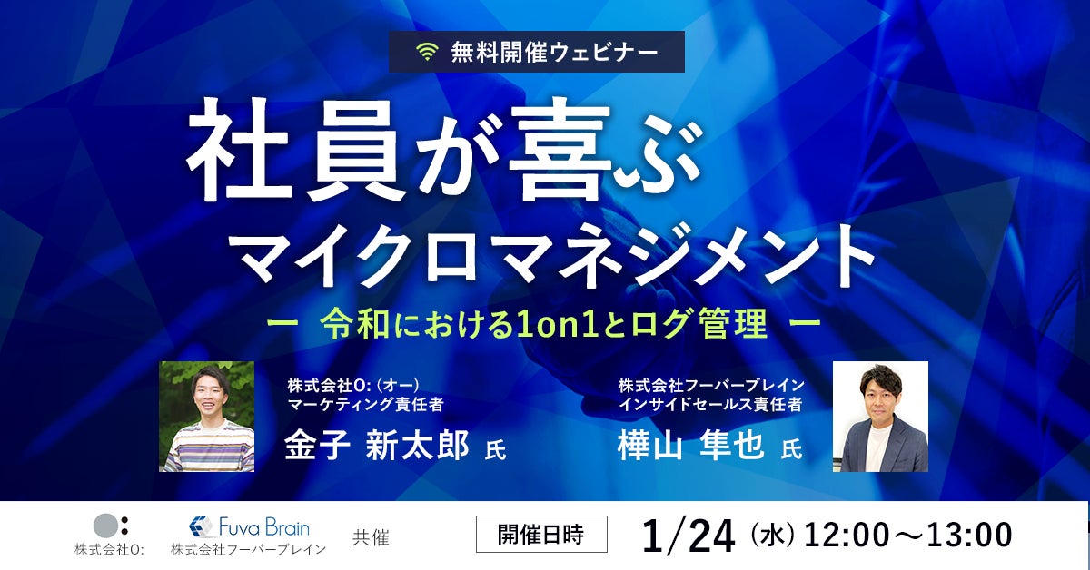 株式会社フーバーブレイン(本社:東京都千代田区、代表取締役社長:輿水 英行)は、株式会社O:(オー)(本社:東京都杉並区、 代表取締役 CEO:谷本 潤哉)との共催で『マイクロマネジメント』をテーマにしたウェビナーを、2024年1月24日(水)12:00に開催いたします。(お申し込み:https://www.fuva-brain.co.jp/webinar-240124/ )