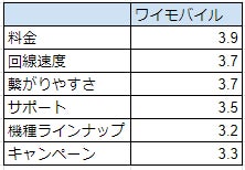 以下は、項目ごとにワイモバイル満足度の平均点をだしたものです。