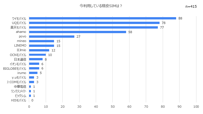 最も利用者が多かったのはワイモバイルで88名(14%)でした。そしてUQモバイル78名(18.8%)、楽天モバイル77名(18.6%)と続いています。