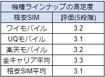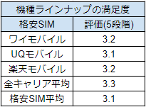 ワイモバイルの機種ラインナップの満足度は5点満点中 3.2点。全キャリアの平均点 3.3点には一歩届かない結果となりました。