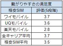 UQモバイルとは同評価、楽天モバイルとは0.1点の差がありますが、満足度はほぼ同じです。全キャリアの平均点と比較すると、0.4点の差をつけてワイモバイルがリードしています。