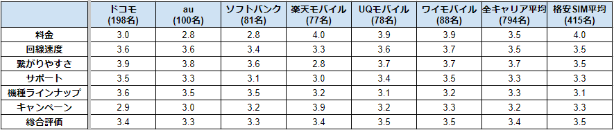 上記を見てわかるように全キャリアの総合評価は3.4点であり、その点数を超えているのはワイモバイルとUQモバイルのみになります。