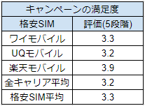 ワイモバイルのキャンペーンの満足度は5点満点中 3.3点。全キャリア・格安SIMの平均点に達しています。