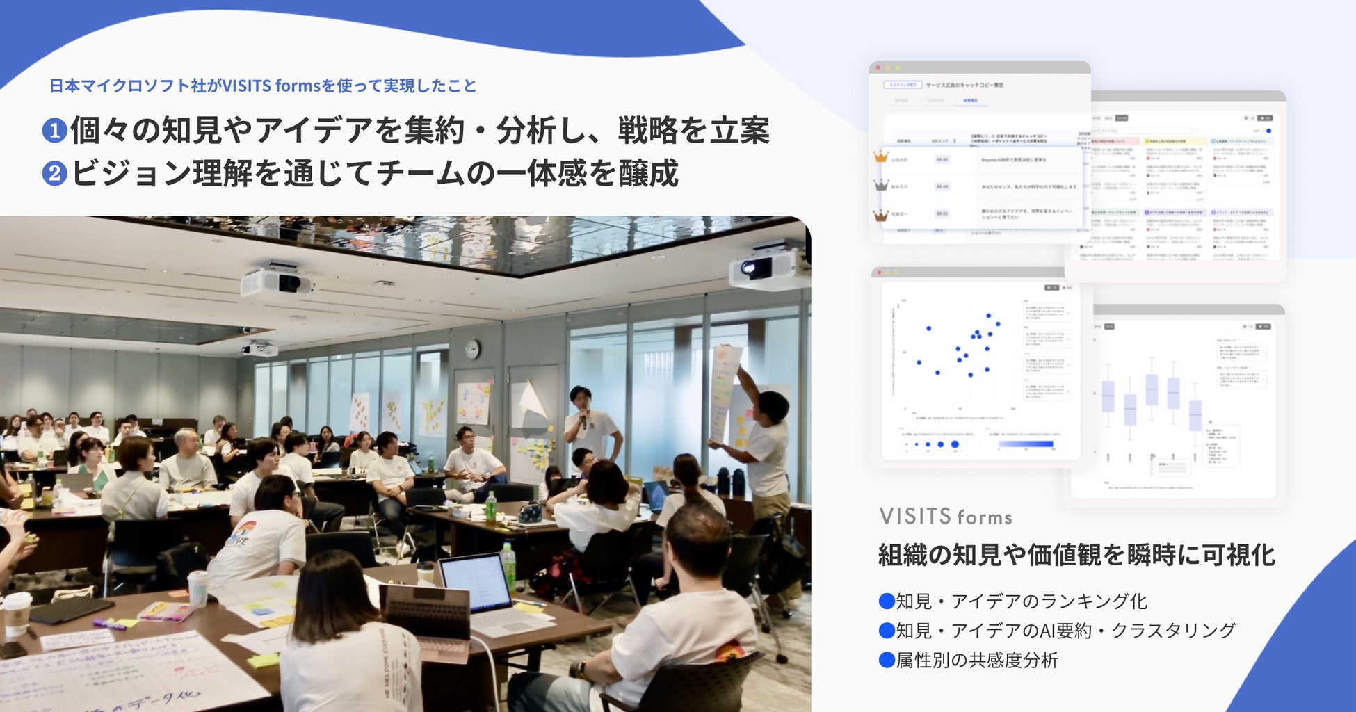 VISITSは、日本マイクロソフトとの協力を通じて、AI技術を駆使した日本企業の変革をさらに加速させます。すでに、日本マイクロソフト社内でも「VISITS forms」が導入され、戦略策定や社員のビジョン浸透を目的に活用いただきました。