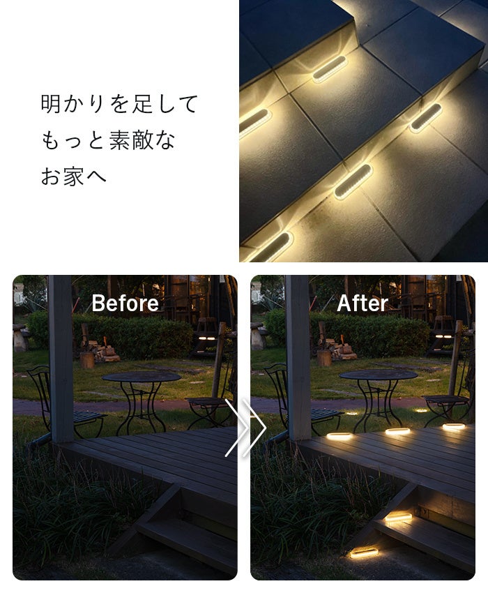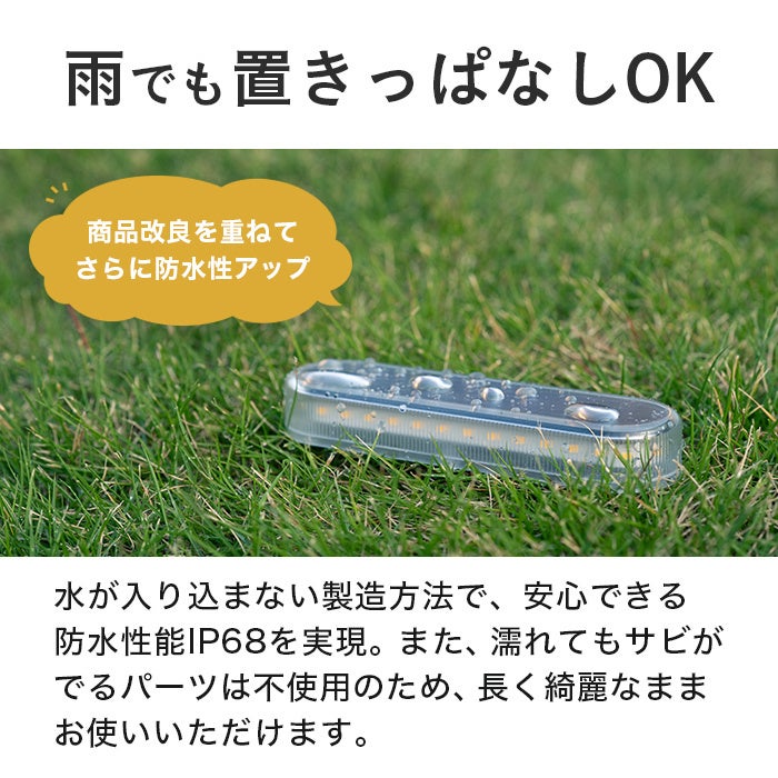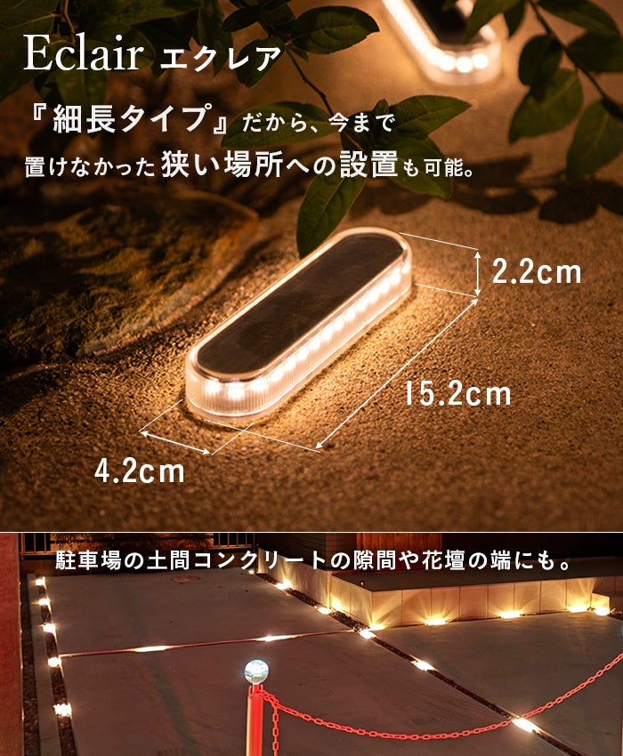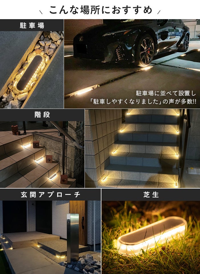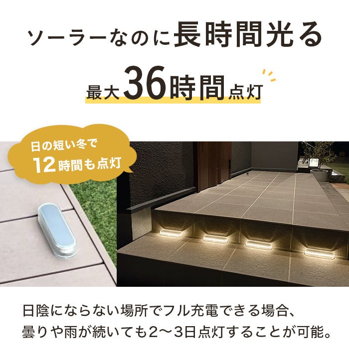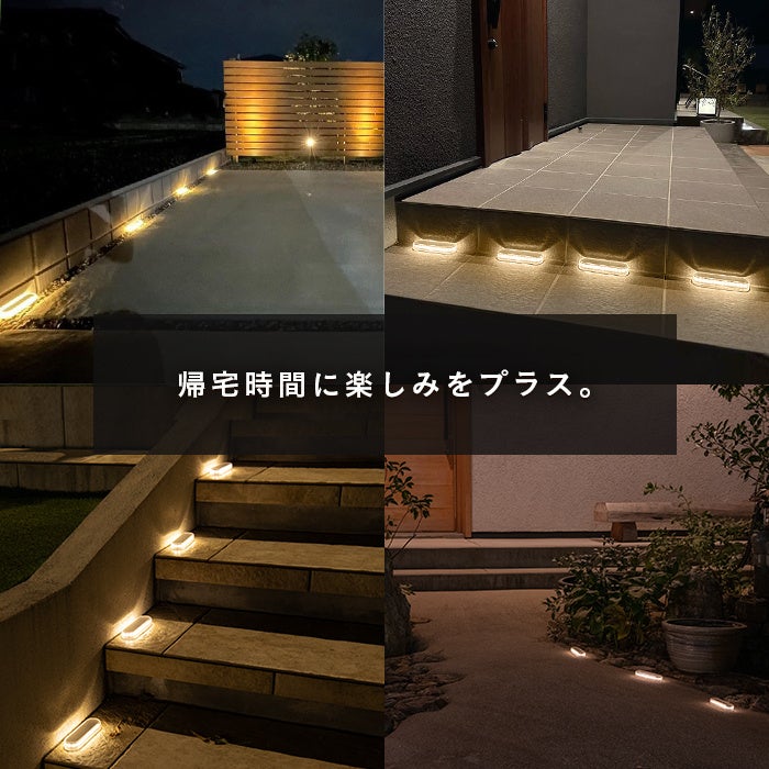 5tの車で踏んでも壊れない高耐久なソーラーライト。置くだけで夜の外構が上品に輝き、しっかりフル充電ができていれば、曇りや雨の日が続いても2〜3日間は安定して点灯。強靭さと美しさを兼ね備えたライトが、夜の景観をスマートに彩ります。