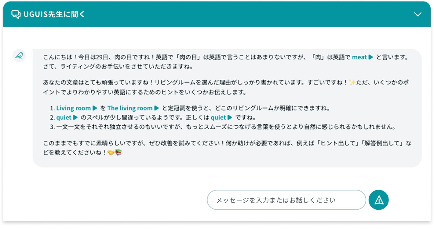 AIチャット機能「UGUIS先生」が進化!スピーキング対策においても、添削結果や解答内容に関する疑問を、チャット形式で気軽に相談が可能。その場で疑問を解消でき、効率的な学習に貢献します。更に、音声での正しい発音もサポートします。