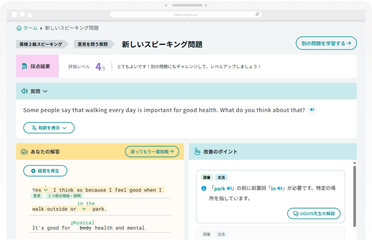株式会社EduLab(エデュラボ 本社:東京都港区、代表取締役社長兼CEO:廣實 学)のグループ会社である株式会社教育測定研究所(代表取締役社長:西田 紀子、以下「教育測定研究所」)は、「UGUIS.AI」に新たに英検®スピーキング対策機能を開発し、ベータ版として公開したことをお知らせいたします。これにより英語ライティング学習サービスであったUGUIS.AIは、スピーキングにも対応し、英語のアウトプット学習をさらに強化いたしました。