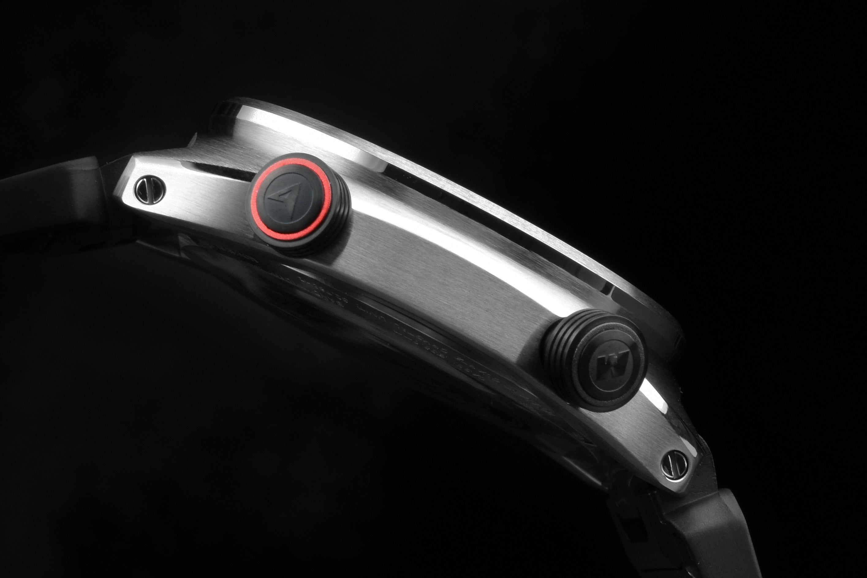 一般的な時計では3時位置にレイアウトされるボタン類を、全て逆側9時位置に配置することで、走行時に着用してもボタンの誤作動がなく、ハンドル操作を妨げない2輪ライダーにとって実用的なデザインとなっています。 グローブをしたままでも扱いやすく、必要な時にサッと触れる、気負わず使える操作性を実現しました。
