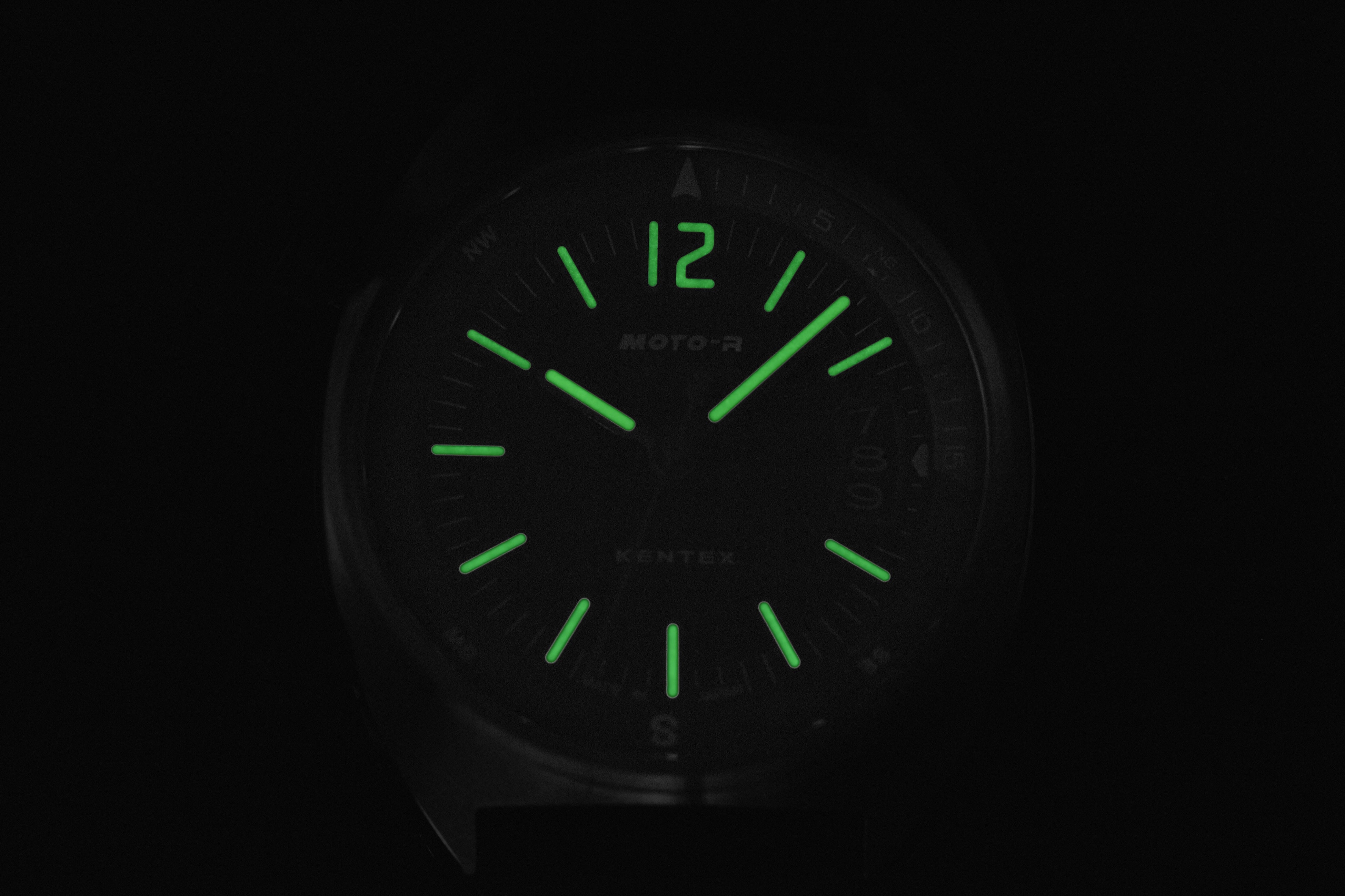 走行中のわずかな視線移動でも時刻を即座に読み取れるよう、12時位置には視認性の高いアラビア数字インデックスを単独で配置。スピードに乗った状態でも上下の向きや針の位置関係を迷わず把握でき、長距離ツーリングでも疲労を溜めずに走りへ集中できます。また、インデックスと針には高性能の強蓄光を採用し、トンネルや夜間走行、早朝の薄暗い場面でも針と目盛りがしっかりと浮かび上がるよう設計。暗所でも必要なタイミングで時刻を確実に確認でき、ライダーの安全性と快適性を支えます。