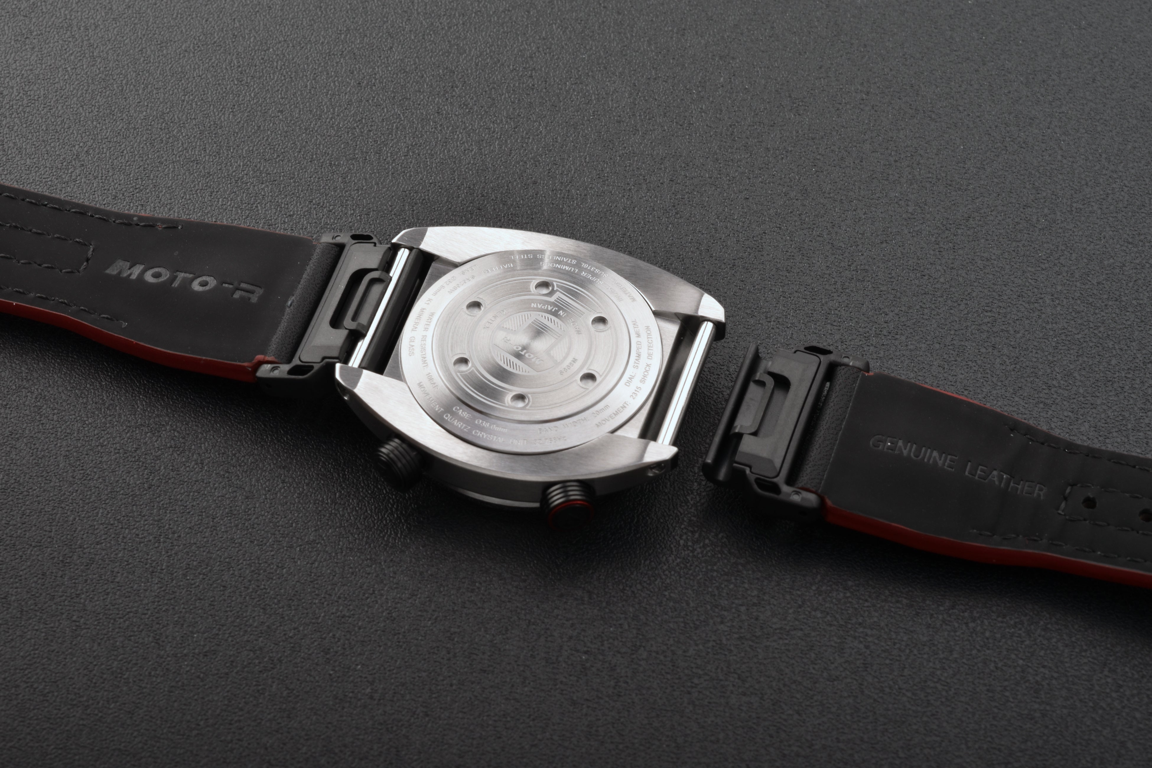 採用したムーブメントには、振動や衝撃を検知して動作を補正する「ショックディテクションIC」を搭載。ICセンサーが電流量を制御し、ステップモーターの動作を最適化することで、衝撃時の歯車の乱れや針飛びを抑制します。結果として、ライディング中でも安定した時刻表示を維持する高い耐振・耐衝撃性能を実現しました。