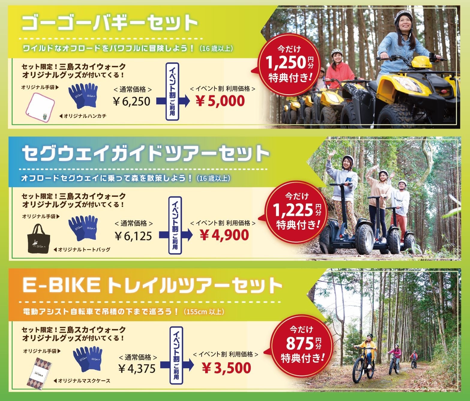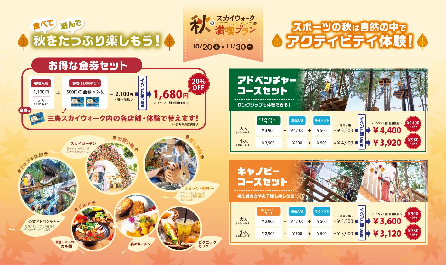 吊橋の入場と施設内いろいろ遊べるクーポン券をお得に買えるセットや、フォレストアドベンチャー体験と人気のソフトクリームがセットになった「秋のスカイウォーク満喫プラン」と、ライドアクティビティの体験にスカイウォーク限定グッズが特典でついてくる「ENJOY THE RIDE」。