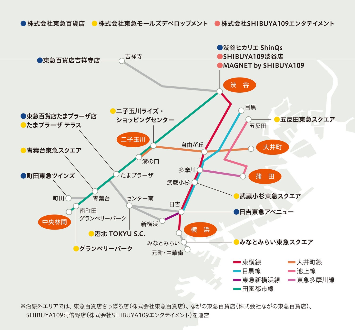 ※株式会社東急百貨店、株式会社東急モールズデベロップメント、株式会社SHIBUYA109エンタテイメント、 株式会社ながの東急百貨店、渋谷地下街株式会社、東急商業發展(香港)有限公司の6社