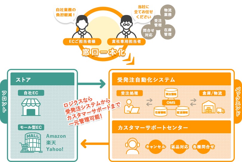 本サービスは、ECサイトの運営に伴う受注以降のオーダー管理、顧客管理、発送作業、在庫管理等のカスタマーサポート(CS)業務と物流業務をワンストップで支援するものです。
