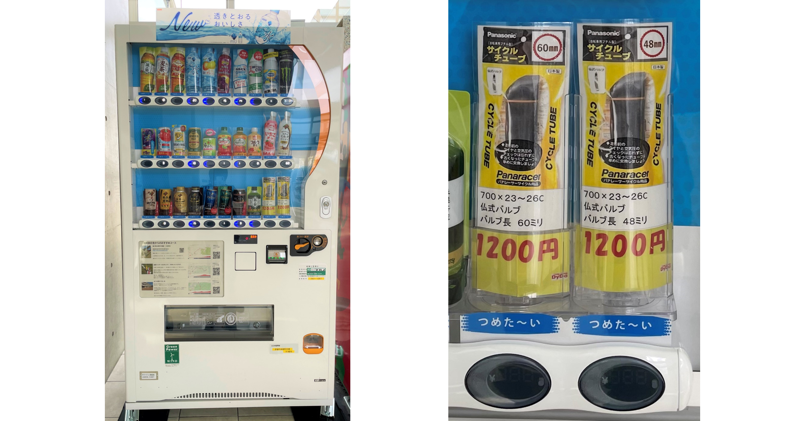 本自販機は、伊達市が始動した「サイクルツーリズム×交流をテーマにした廃校活用プロジェクト」※ に賛同し、自動販売機を通じて貢献できればと企画したもので、飲料とともに自転車用タイヤチューブ(2種類)を購入することができます。