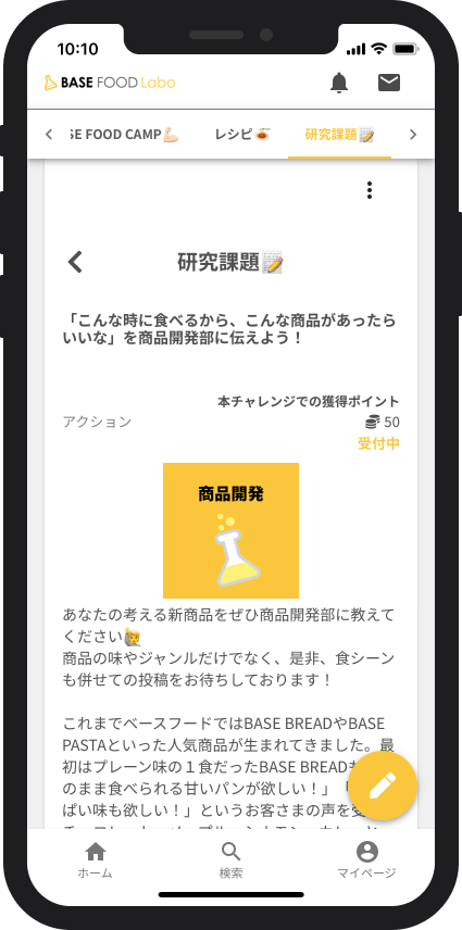 ベースフードから研究員に向けて、商品・サービスに関するテーマを「研究課題」として提示。研究員はテーマに合わせてコメント投稿のみで気軽に参加可能です。この「研究課題」からは、これまでにも商品改善や新商品のアイデアになるヒントがうまれており、オリジナルアプリではコンテンツを5個に拡大し、今後、各コンテンツに基づいた研究課題を随時追加していく予定です。