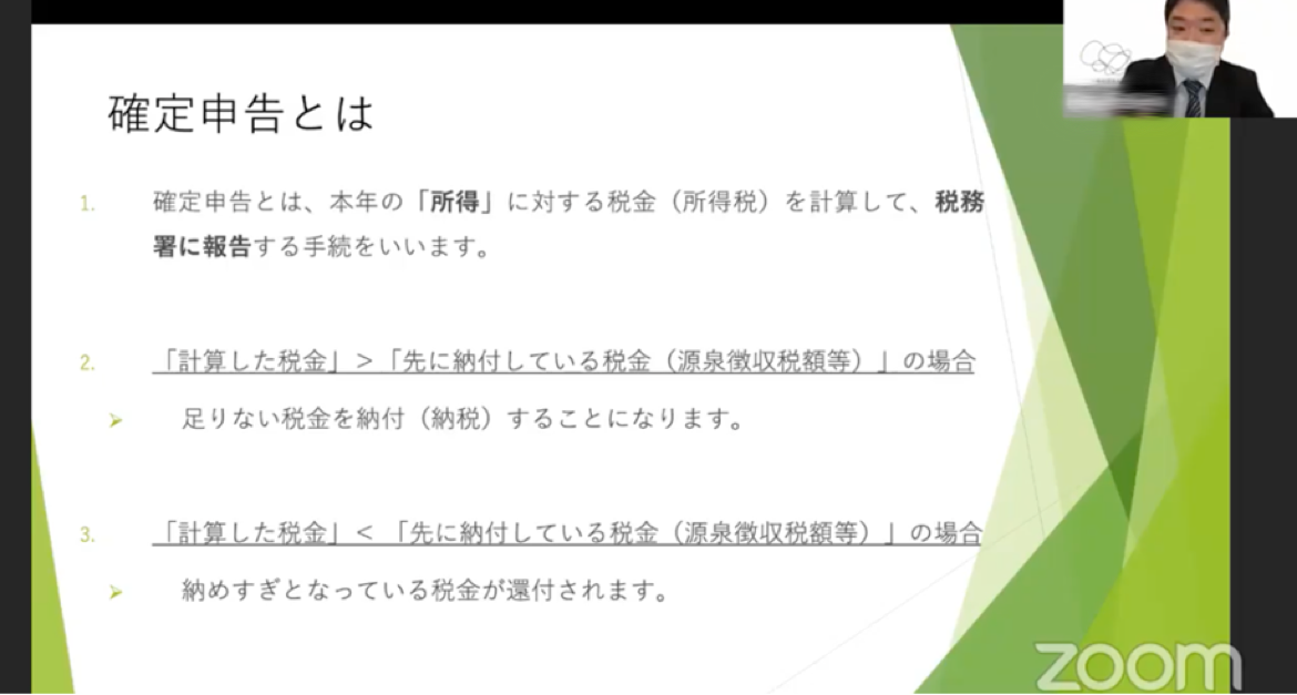 明日から、確定申告の受付が始まります。本日の講座は、これまで、確定申告について、あまり馴染みのなかった方が、基本的な制度・仕組みを知りうる、非常によい機会になるのではないかと捉えています。