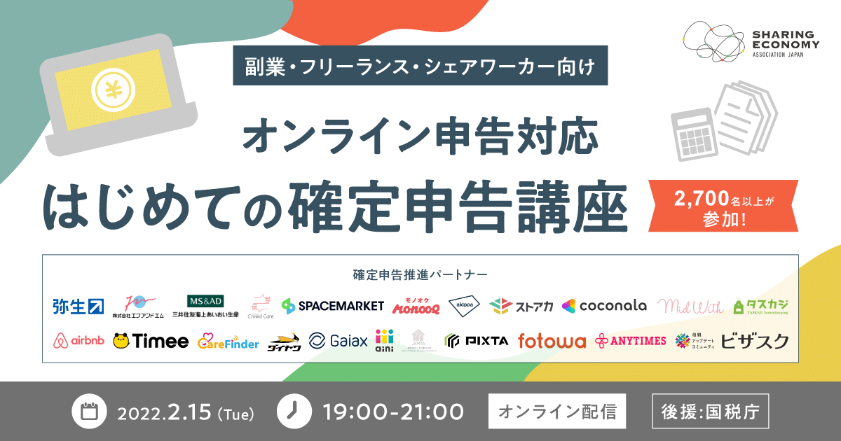 2022年2月15日(火)シェアリングエコノミー協会は、国税庁後援の下、20社の事業者と連携して「確定申告入門講座」を開催。本セミナーは2018年から毎年実施しており、今年は過去最高となる2,700名(*1)以上の方にご参加頂きました。