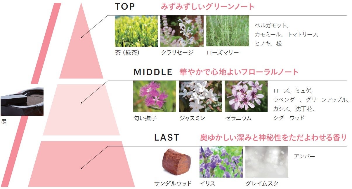アロマティックハーブの香りと、墨・茶・匂い撫子という“和の香り”との出逢いから生まれた、凛としてみずみずしさがただよう香り。