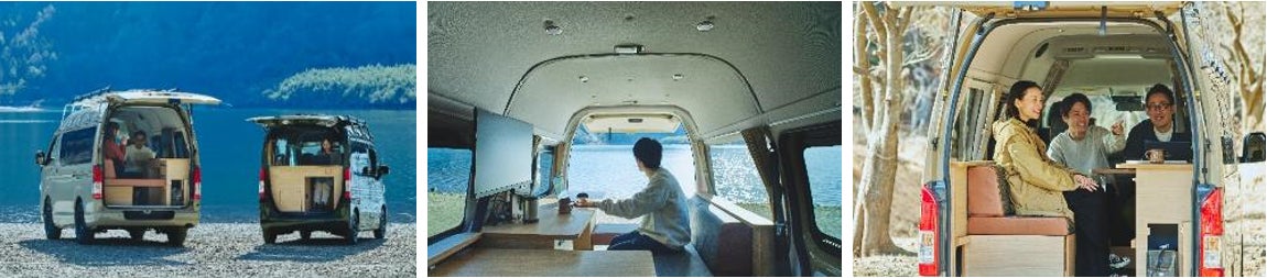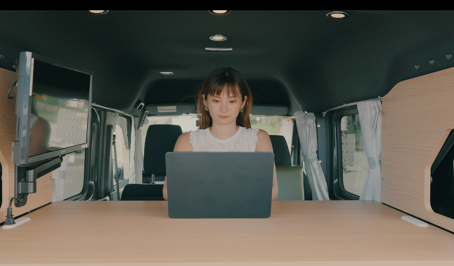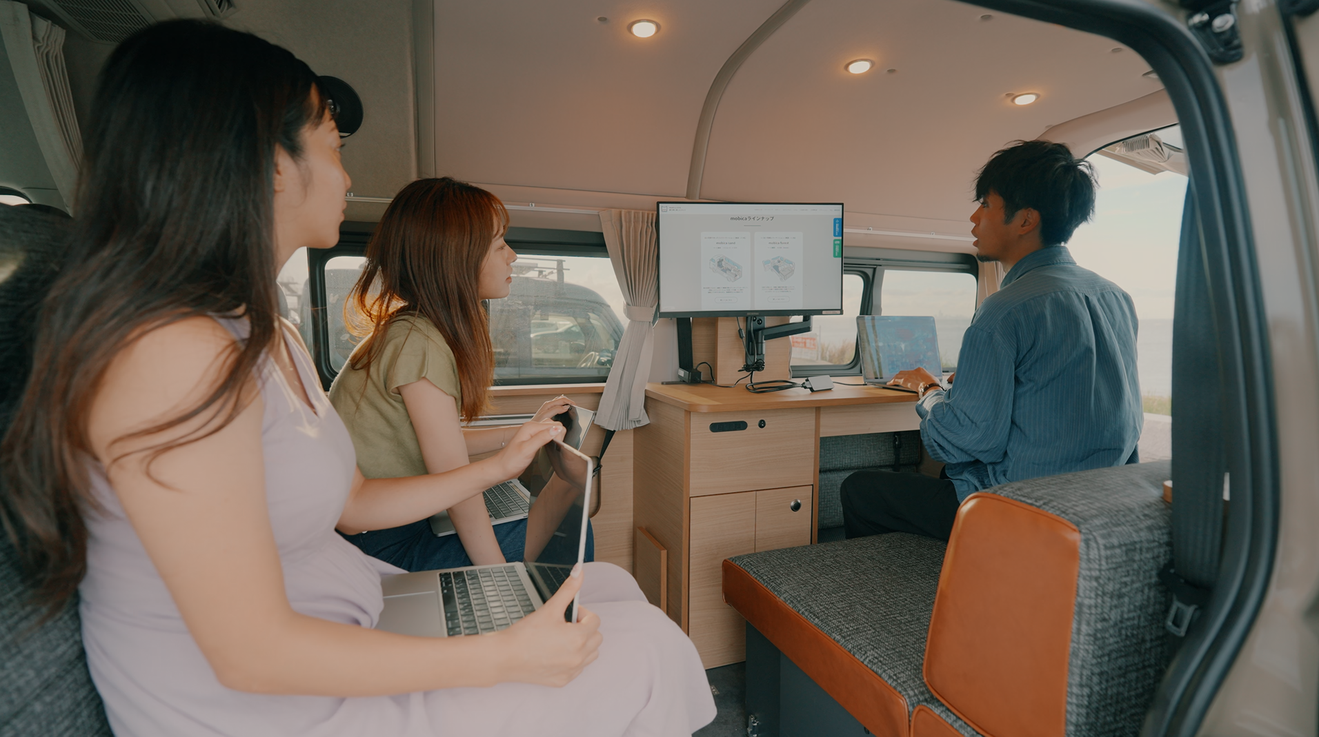「mobica」は約30年にわたって働く場をつくるオフィス事業を手掛けてきたGOOD PLACEが考えた、好きな場所へ移動しながら車内外で快適に働くことができるワーケーションカーです。車内にはコンセントやUSB電源が搭載されたポータブル電源を積載しているほか、Wi-Fiも完備しています。シートを倒してフルフラットにすれば、身体を横にできるベッドスペースが出現します。車両はハイエース(TOYOTA)とN-VAN(Honda)をワークスペースに架装した2種類展開で、利用人数に応じて選択できます。どちらの車両も業務や気分に合わせて自由に働くスペースを選び、カスタムできる仕様です。