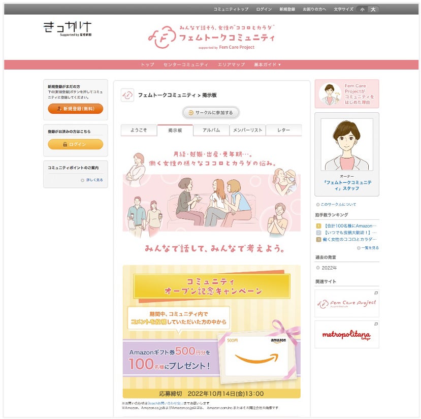 2022年8月4日、産経新聞社(東京都千代田区/代表取締役社長:近藤 哲司)と、ファンコミュニティ構築・運営大手のクオン(東京都港区/代表取締役:武田 隆)は、新たに 「フェムトークコミュニティ Supported by Fem Care Project」(https://www.beach.jp/community/FEM-TALK/)を、産経新聞社のコミュニティである「きっかけ」内にオープンしました。