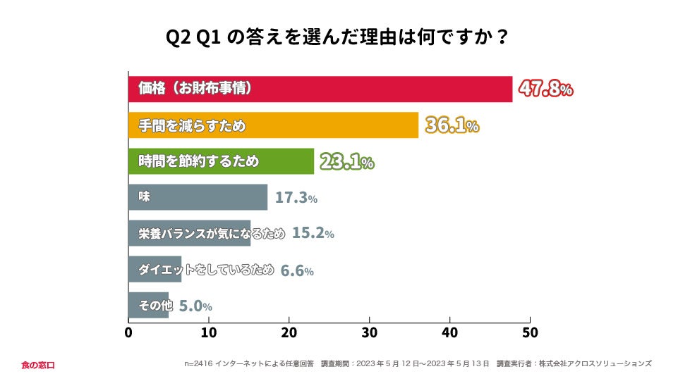 Q2 価格(お財布事情)を理由にお昼ご飯を選んでいる人が最も多く47.8%。手間を減らすため、時間を節約するためと回答した人がそれに続いた。