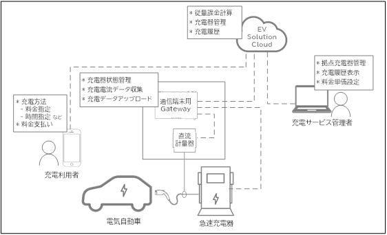 EVへの充電量から従量課金を行い、充電利用者はスマホのアプリから、料金指定・時間指定・残量指定等を選択することができ、従来のSSでの給油方法と同じように、様々な充電方法に対応したシステムを開発。SS事業者は契約している電力会社の料金体系やカレンダー(平日/休日など)、独自サービスに合わせて時間毎に充電料金の単価を設定することができる。また、スマホのアプリから充電を開始すると、SS事業者や近くの提携店舗のクーポンを発行することができる。
