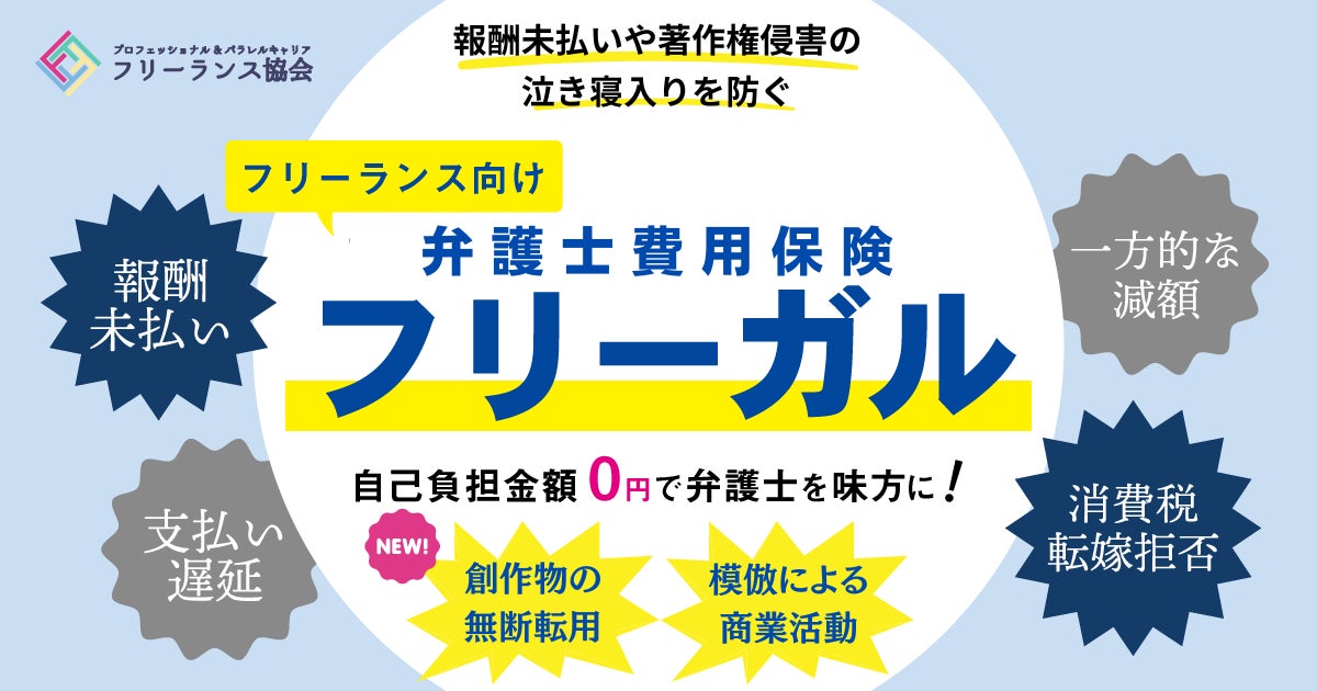 一般社団法人プロフェッショナル&パラレルキャリア・フリーランス協会(代表理事:平田麻莉、以下「フリーランス協会」)と損害保険ジャパン株式会社(代表取締役社長:石川耕治、以下「損保ジャパン」)は、連携して提供しているフリーランス専用の報酬トラブル弁護士費用保険『フリーガル』の対象とする事故の範囲を、2024年9月15日から拡大します。