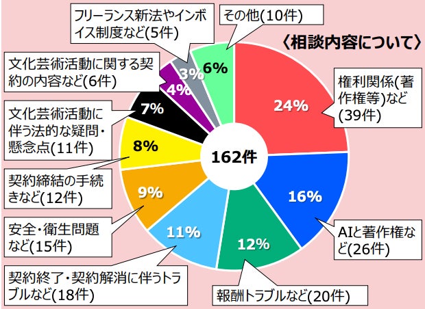 文化庁では、2023年9月1日より、安心・安全な環境で文化芸術活動が行えるよう、契約や活動に関係して生じる疑問やトラブル等について、弁護士が相談対応を行う『文化芸術活動に関する法律相談窓口』を開設しており、事業を委託した『弁護士知財ネット』の担当弁護士が無料で相談に対応しています。同窓口の2023年度(2023年9月1日から2024年3月31日の213日間)の相談受付実績は162件であり、相談内容としては著作権等の権利関係に関わるものが最も多く全体の24%を占めました。