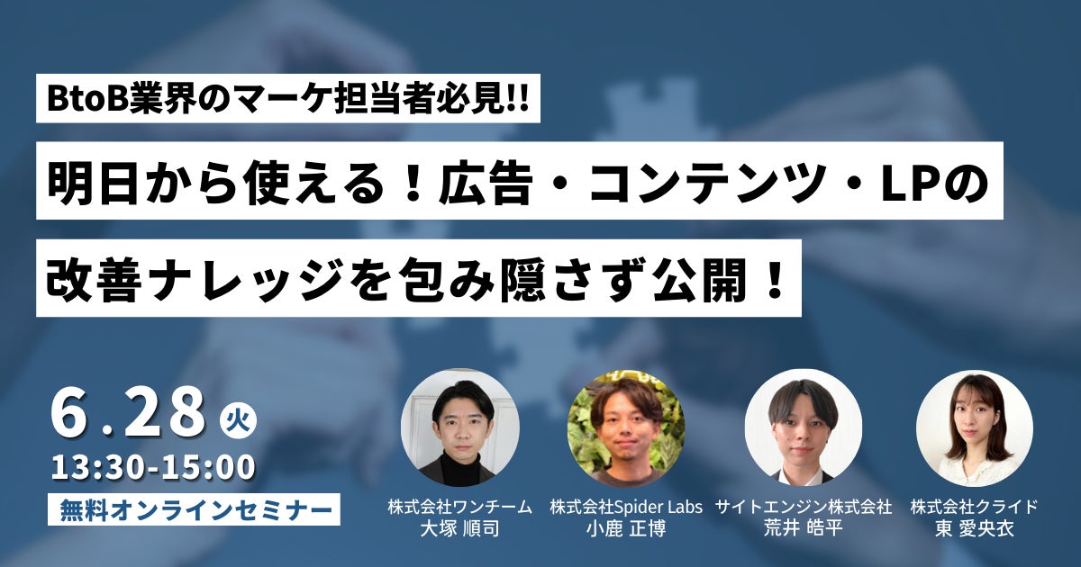 「改善のタネを広める」を経営理念としてWebマーケティング支援サービスを提供するサイトエンジン株式会社(本社:東京都世田谷区 代表取締役:毛塚 智彦)は、2022年6月28日(火)13:30~15:00に、株式会社ワンチーム(本社:東京都渋谷区 代表者:渡会 雄一)、株式会社Spider Labs(本社:東京都港区 代表取締役:大月 聡子)、株式会社クライド(本社:東京都渋谷区 代表取締役社長:服部 司)との” 【BtoB業界のマーケ担当者必見!!】明日から使える!広告・コンテンツ・LPの改善ナレッジを包み隠さず公開!” を開催します。