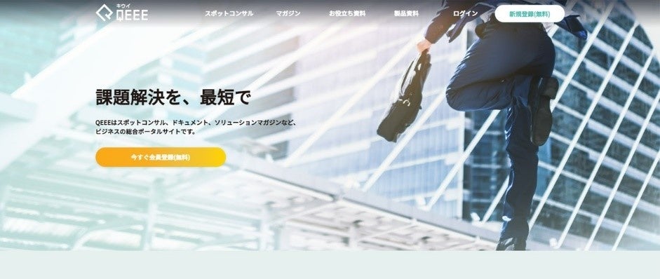 内容:「QEEE」は、さまざまなソリューション比較コンテンツの「マガジン」、ホワイトペーパーやビジネステンプレートなどを無料ダウンロードできる「お役立ち資料」、各種ソリューション資料を無料ダウンロードできる「製品資料」、各業界のエキスパートのコンサルティングが受けられる「スポットコンサル」で構成された、ビジネスの総合ポータルサイトです。