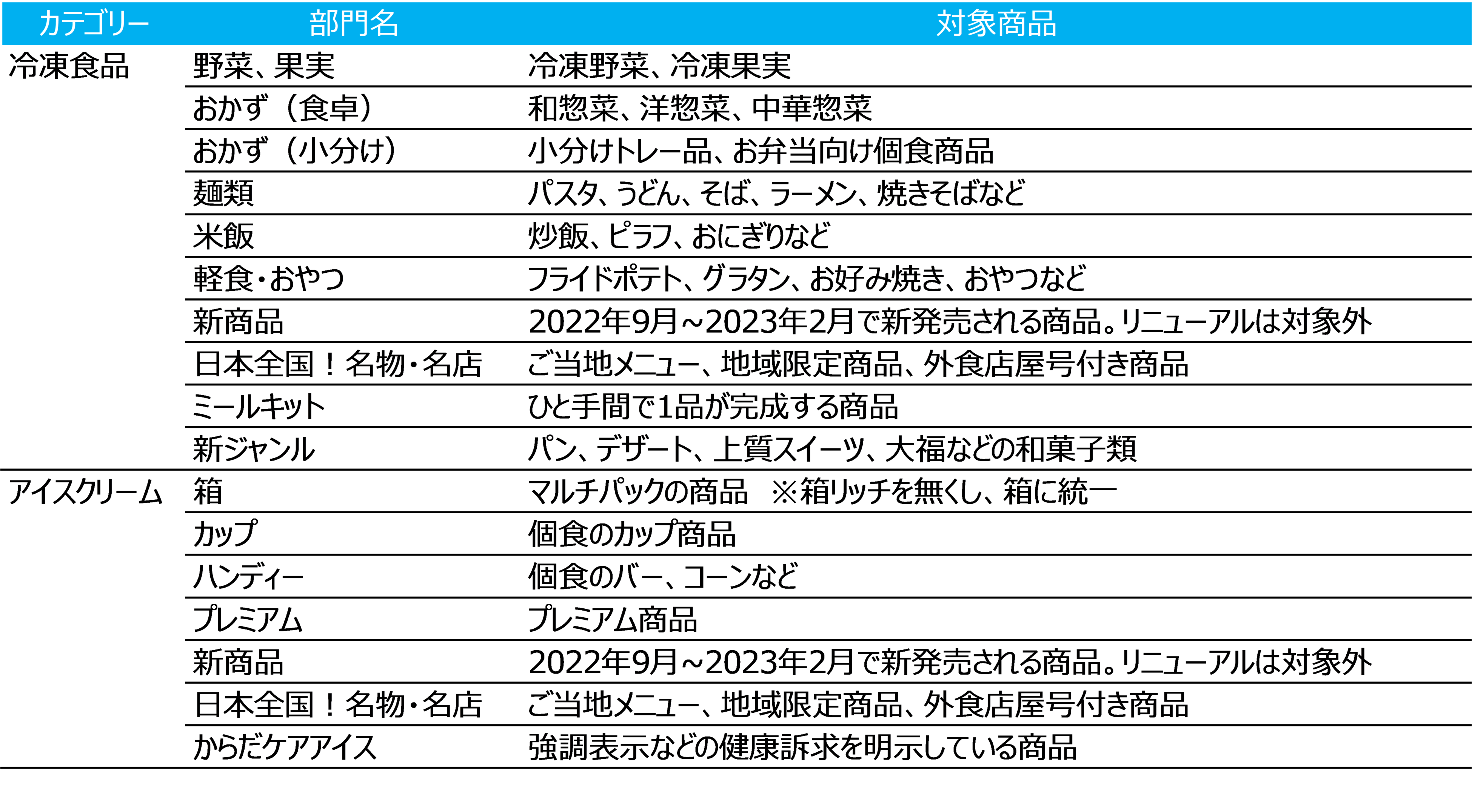 〇投票部門 カテゴリー軸で設定。冷凍食品9部門、アイスクリーム7部門から構成されます