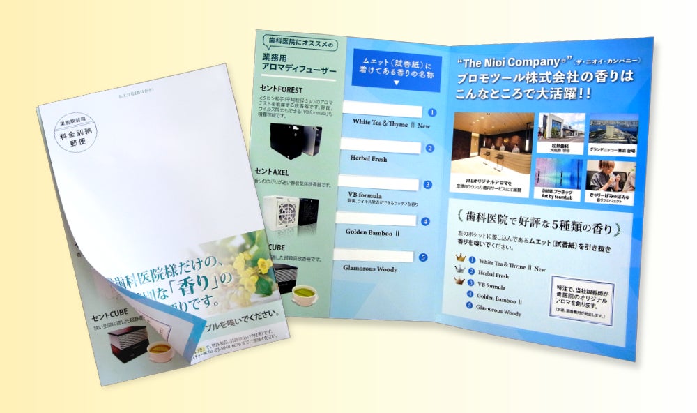 新商品発売のタイミングに合わせて事前にお客様に発送して置き、商談やアポイント時に香りを確認し合いながら話し合いを進めることができ、マーケティング・販促業務の効率化を図ることができます。また『ムエカ』から、敢えて香りが少しだけ漏れるようにすることで、『ムエカ』を受け取ったお客様が、‶香りDM″だと直ぐ気付いて開封して下さるので、開封率が非常に高く、強い興味をもっていただいて、アポイント獲得へと進むことができます。(当社比)