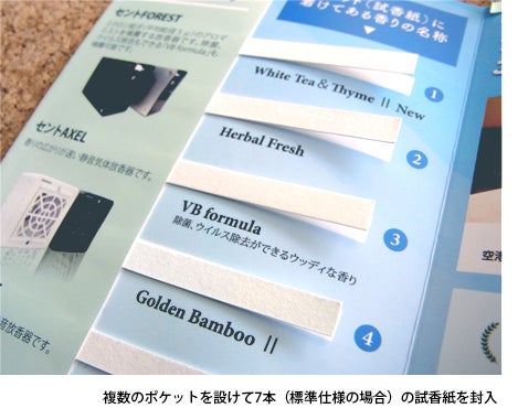 『ムエカ』(MouilleCARD、商標登録済)は、Mouillette(試香紙)とCARDと言う二つの単語を繋げた造語です。三つ折りした圧着ハガキの内側に特殊加工を施し、複数のポケットを設けて複数(標準仕様は7本)の試香紙を封入できるようにしたハガキであり、香り同士が混ざらない工夫がしてあります。