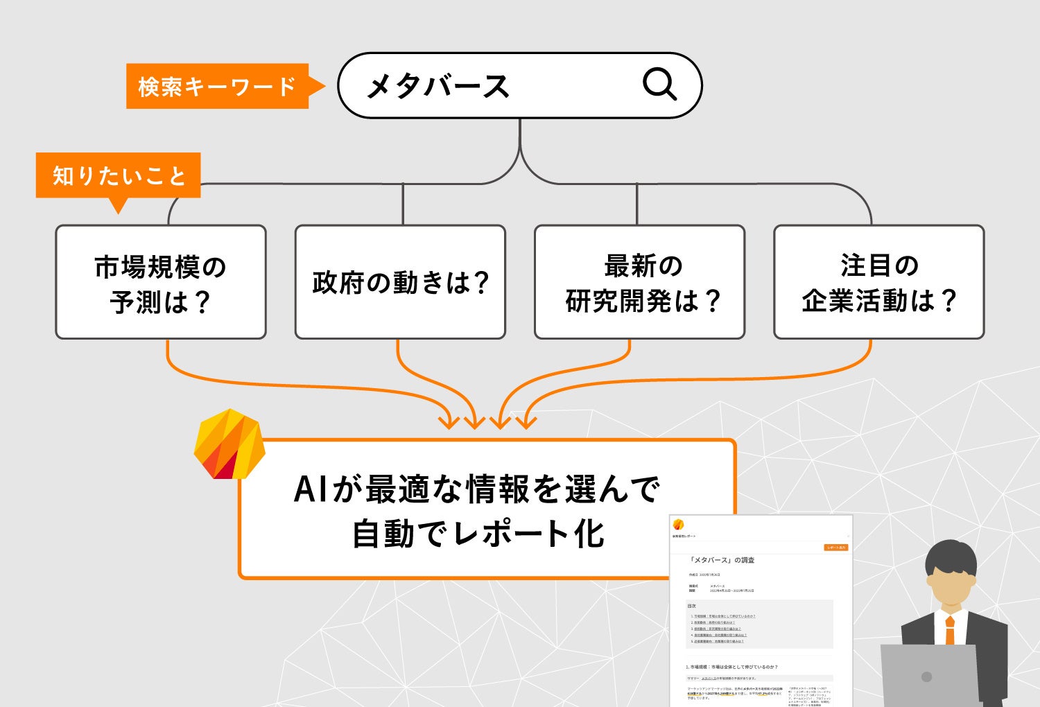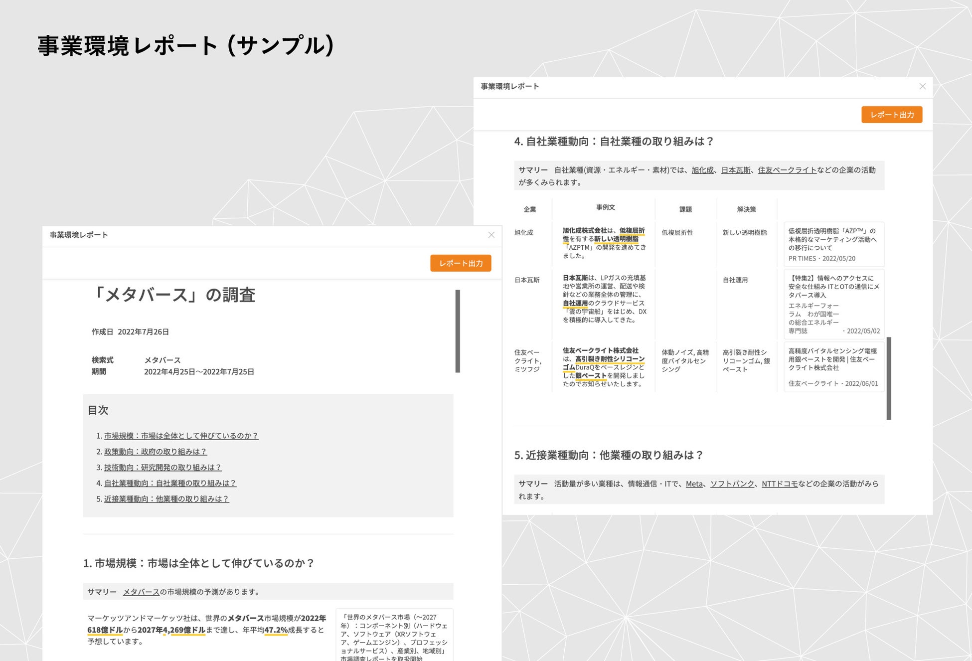 上記の課題に対して、人に代わりAIが回答になる情報を集め、自動でレポートを生成する機能を開発致しました。本機能を活用することで、市場調査にかかる時間を効率化し、新たな事業や製品を構想するアイデア創出や企画業務へ時間をかけることが可能になります。