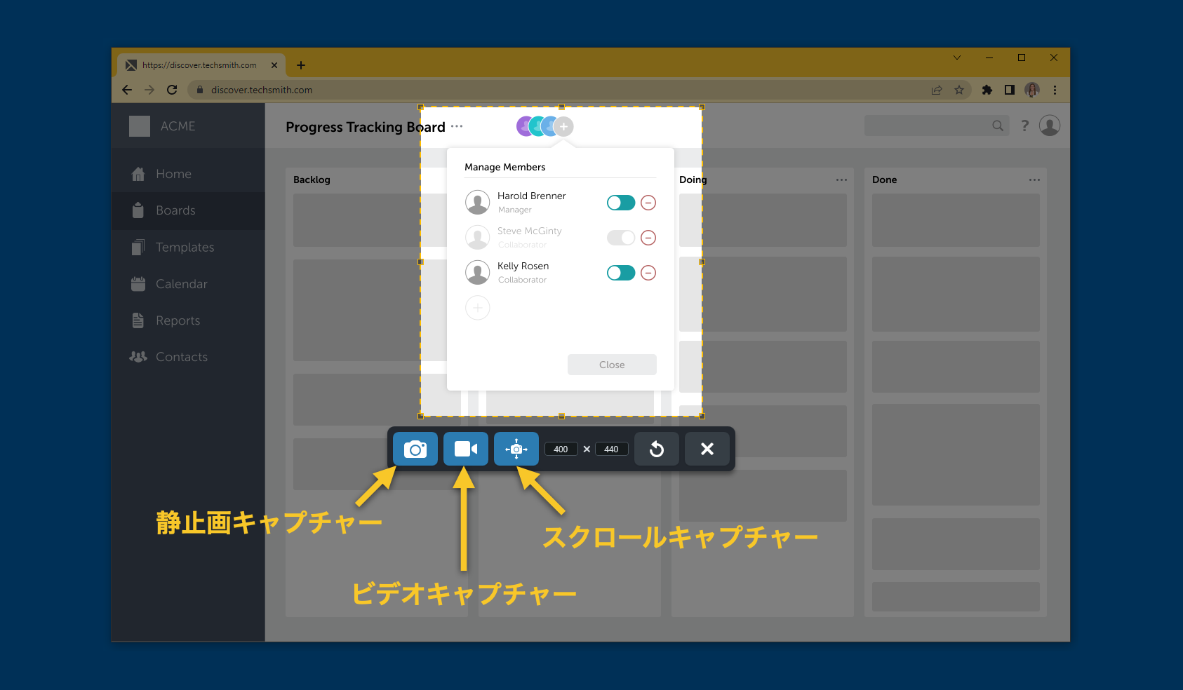 Snagit は多彩な画面キャプチャー機能により、オンラインコミュニケーションが当たり前になった今日、すでに多くの企業で採用されています。静止画だけでなく動画の画面キャプチャーをフル活用して魅力的な資料を素速く作成できることはビジネスにおいて大きなアドバンテージになります。