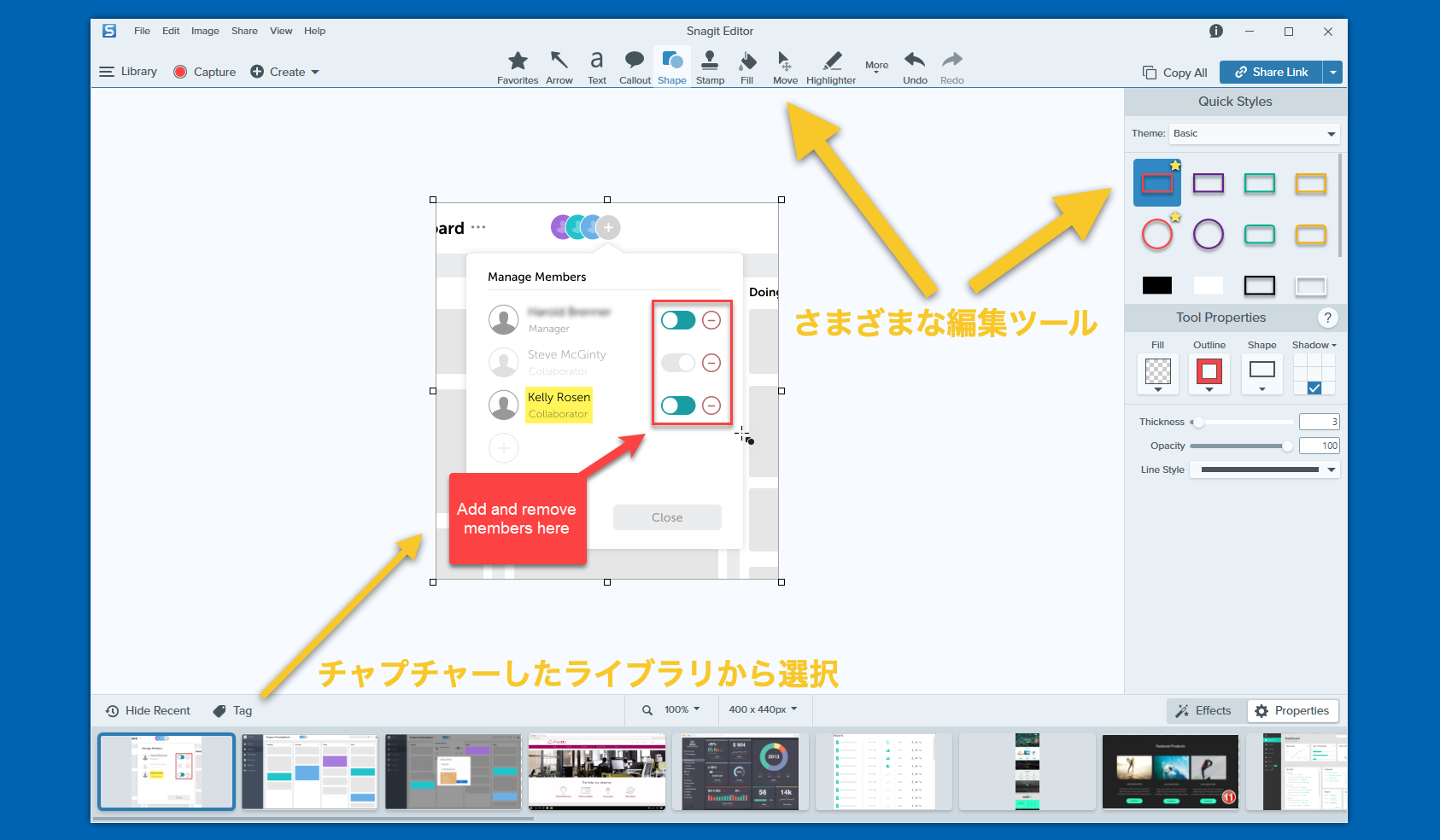 Teams, Google Meet, Zoom など、今日では、オンラインコミュニケーションが主流となりました。お客様へのプレゼンテーションはもちろんのこと、社内での企画会議やスタッフ教育など、様々な分野でビデオコミュニケーションが使われています。そうした中で、不便さを感じた事はありませんか?PowerPoint と Excel だけで充分だとお考えですか?それらのツールで作成する時間はどうですか?もっと素早く、もっと効果的で魅力的なコミュニケーション資料を作成できたらいいですよね。Snagit はオンラインでのコミュニケーションが日本よりもはるかに早く根付いた欧米において、すでに39,000,000人以上のユーザがいます。